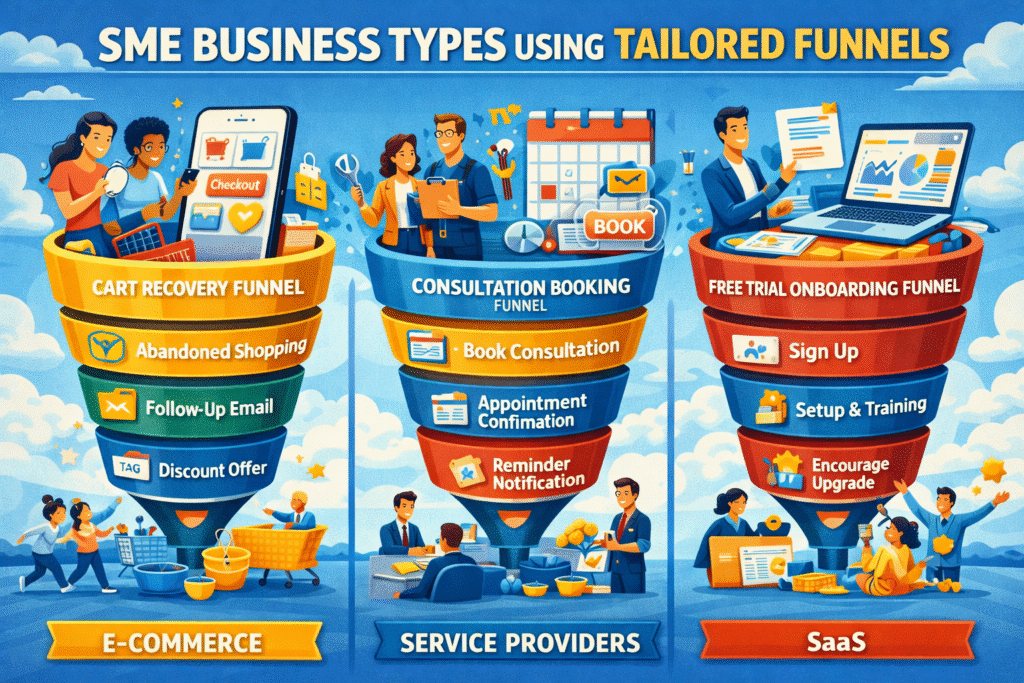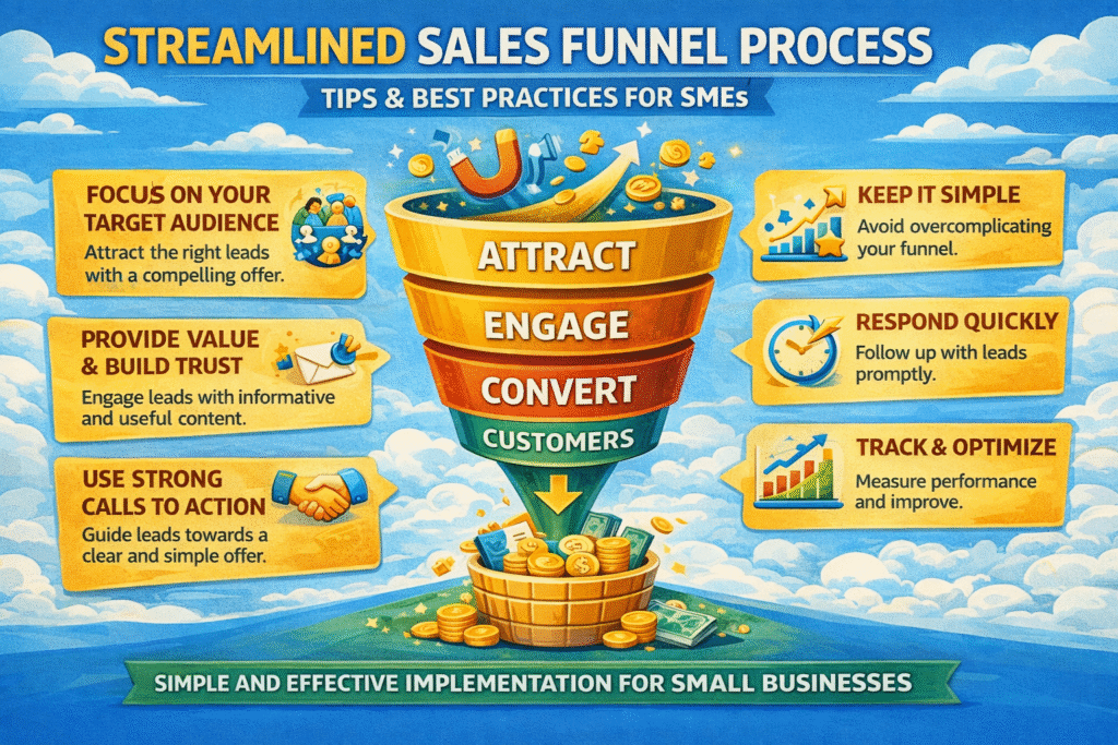 Sales funnels help SMEs by stretching marketing budgets further, turning strangers into loyal customers, automating routine tasks, and increasing conversions without complex marketing jargon.