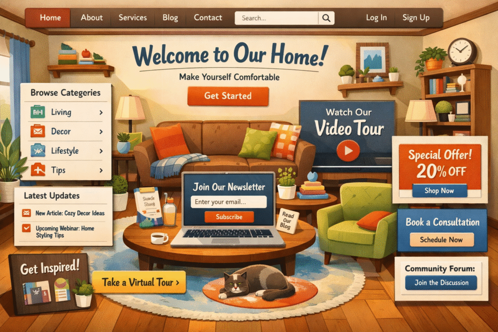 Think of your home page as the digital version of your living room. It is where visitors arrive, look around, check out your unique collection of products or services, and decide where to go next. It is broad, welcoming, and versatile, like a Swiss Army knife but not highly specialized.
