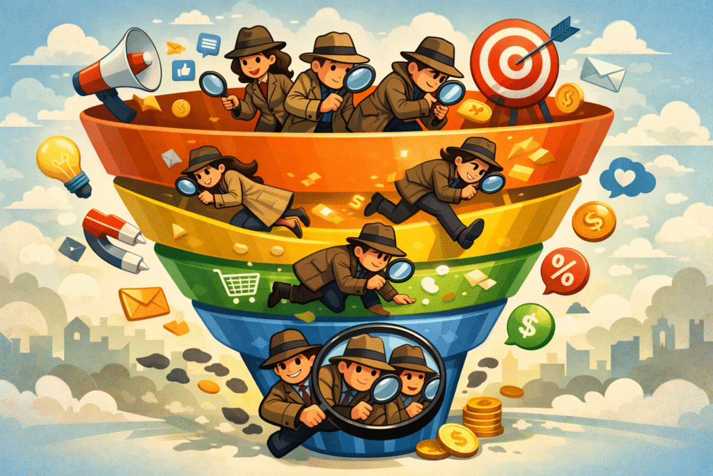 Think of your customers as curious detectives. Instead of solving crimes, they are uncovering whether your brand deserves their trust and money. The marketing funnel acts like their magnifying glass, guiding them from the initial “Who’s this?” to the confident “Take my money.”