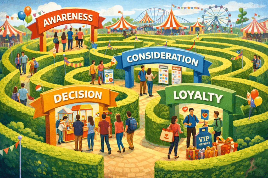 Imagine your potential customers wandering through a carnival maze. The marketing funnel is that maze where the goal is for visitors to discover your product and make a purchase. This journey happens in distinct stages.