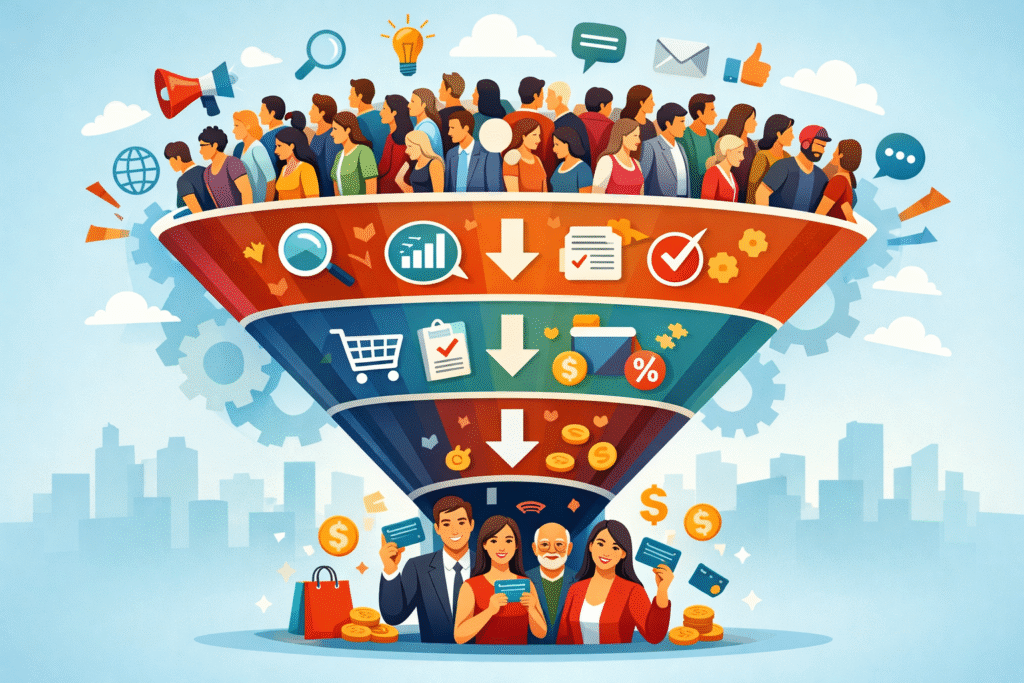 Imagine a funnel. Not the coffee kind, but the marketing kind where many people enter through the wide top and, ideally, a few come out the narrow bottom holding their credit cards. A sales funnel is essentially a roadmap of that journey — from the first spark of curiosity to the moment they say, “Take my money, please,” and beyond.