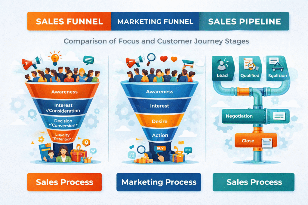 Confused between sales funnels, marketing funnels, and sales pipelines? Here’s a brief explanation: