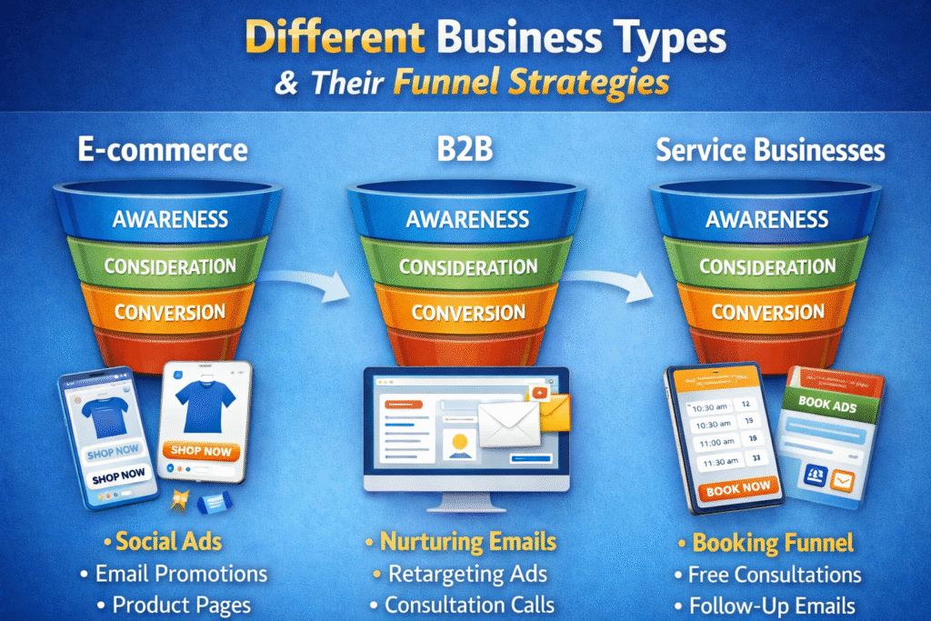 Examples of real-world success include e-commerce brands increasing conversions by up to 30 percent using social ads and retargeting tactics, SaaS companies turning leads into loyal users with nurturing emails and free trials, and local services attracting clients through targeted ads followed by smooth booking funnels.